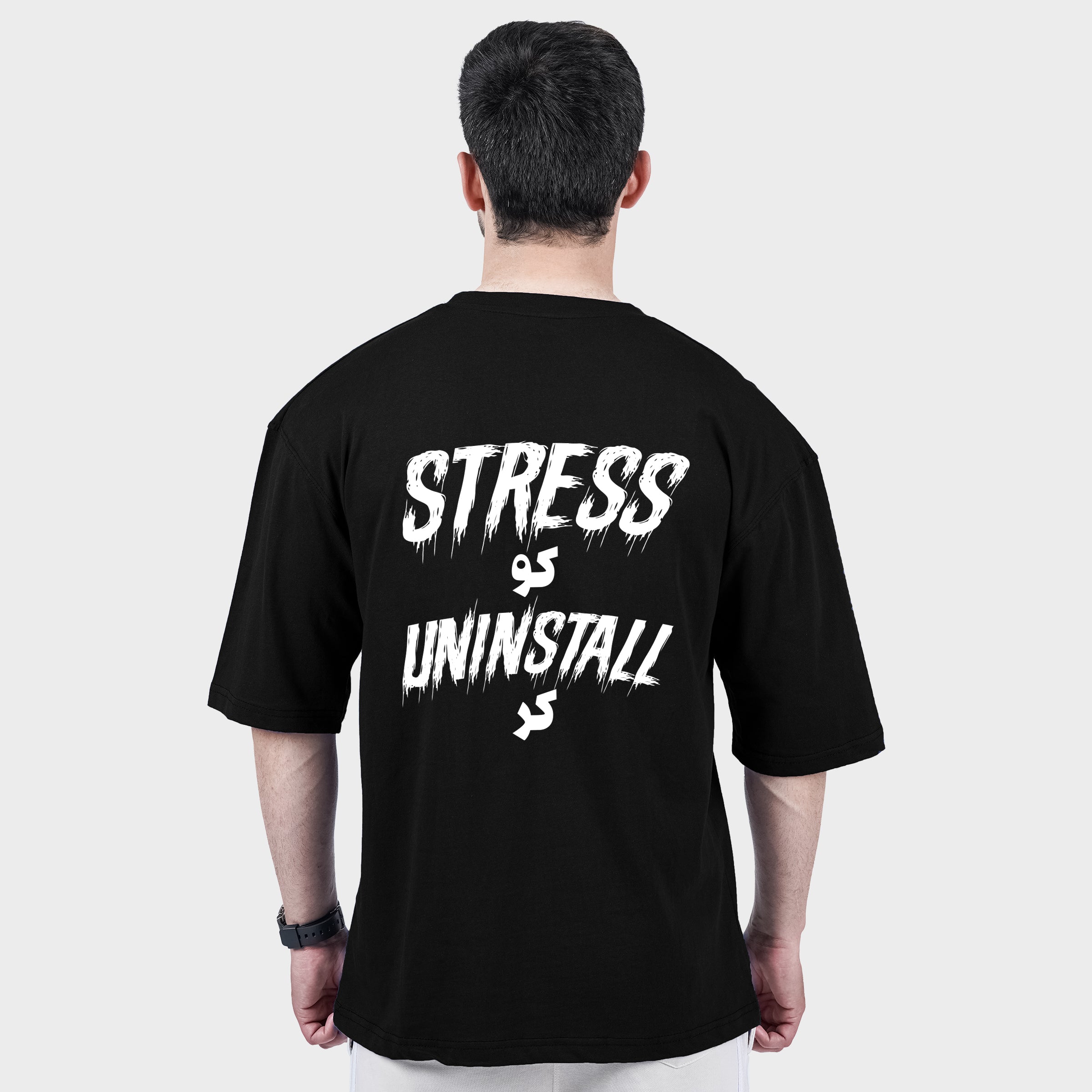 The front comes in a clean plain design for a minimal look, while the back features a bold “Uninstall Stress Black Tshirt.” graphic print that adds strong attitude and personality. Whether you're heading out, relaxing, or styling it with jeans or joggers, this black tee makes a statement effortlessly.