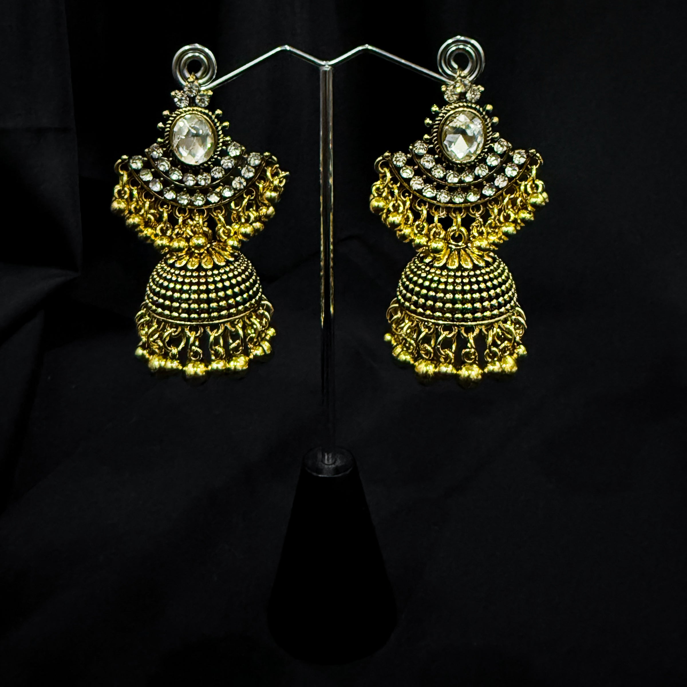 These elegant Jhumka earrings feature a stunning gold base material with a silver coating, making them a timeless and eye-catching accessory. The intricate design adds a touch of elegance to any outfit, perfect for adding a touch of glamour to your look