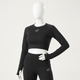 This stylish, form-fitting cropped top features a classic crew neck and contrasting raglan sleeves, designed for both activewear and casual fashion. The main torso is a vibrant red, while the long sleeves and neck trim are black.